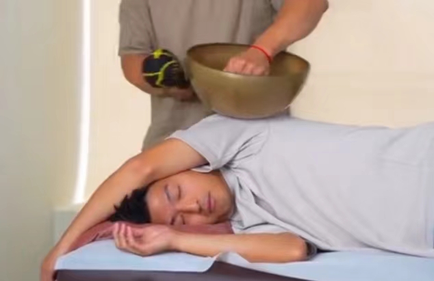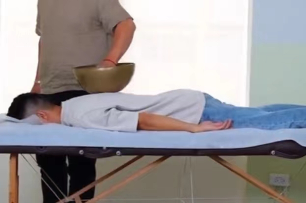 杨裕仲老师【钵·声灸】体验案例,放松脊椎,恢复正位,让血液流动放松,并解释人骨盆歪就会压迫脊椎,影响活动,通过“钵”把声音传导进人体,活血通络,自然就能运动。