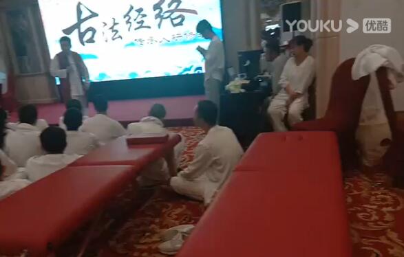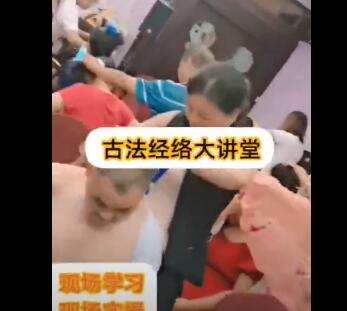 古法经络大讲堂,老师现场展示提关节炎调理方法,通过扣痧技术,拍打膝关节附近相关穴位、经络,疏通堵塞、气血运行,扣出毒素,效果显著。