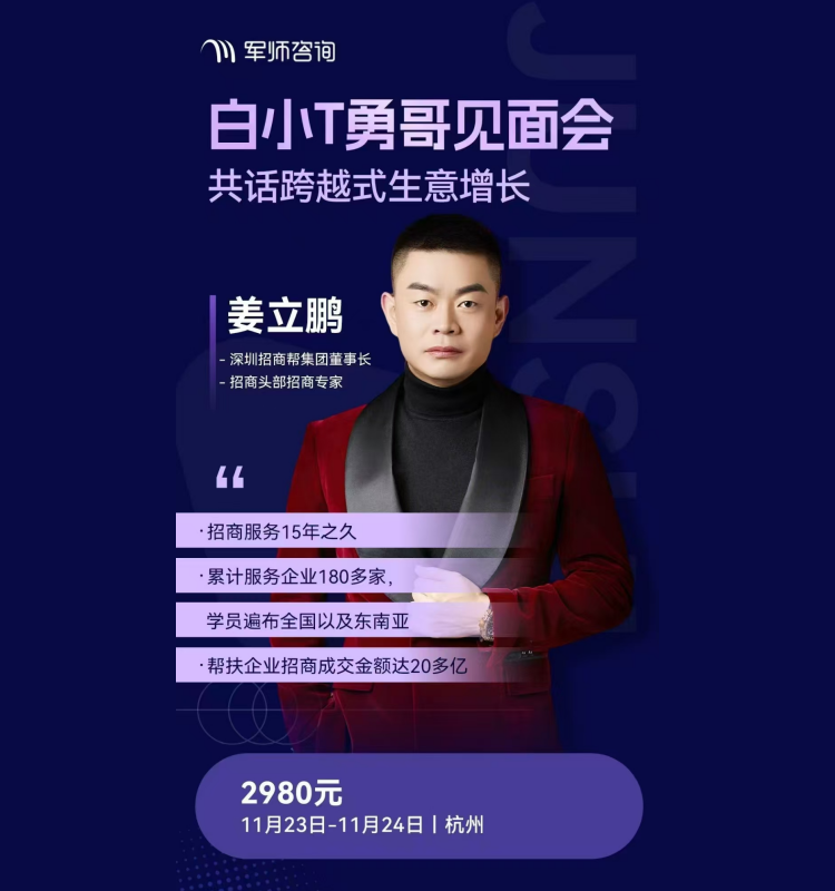 招商帮集团创始人姜立鹏老师出席白小T勇哥见面会,与白小T勇哥共探企业跨越式增长。在当前经济形势下,企业如何突破增长瓶颈,实现快速而稳健的发展,是每一位企业家都在思考的问题。