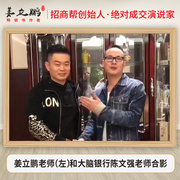 招商帮集团创始人、绝对成交演说家姜立鹏老师——与大脑银行陈文强老师合影留念,交流帮助企业与创业者的指引和扶持,通过知识课程等方式,拓展更多的人脉资源,帮助形成更好的创业平台。