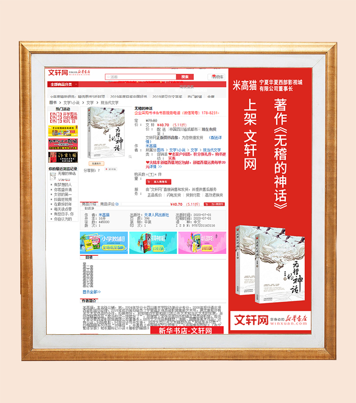 宁夏华夏西部影视城有限公司董事长米高猫老师著作《无稽的神话》中国大陆版上架知名购书渠道平台——文轩网,各专营店纷纷上架,进行火爆热销,体现书籍的被认可程度以及知名度。
