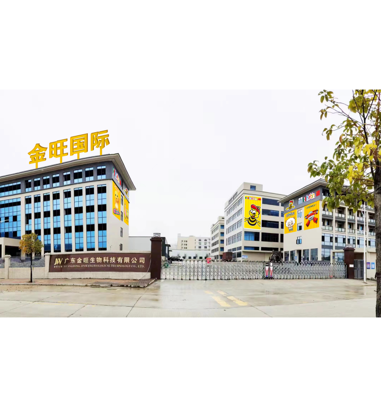 金旺国际有限公司广东生产厂房,厂区大楼广告牌设计展示,包含金稻谷联名合作的奶龙、海绵宝宝、超级飞侠、喜羊羊与灰太狼等IP形象,色彩鲜艳醒目,充满童趣与欢乐。