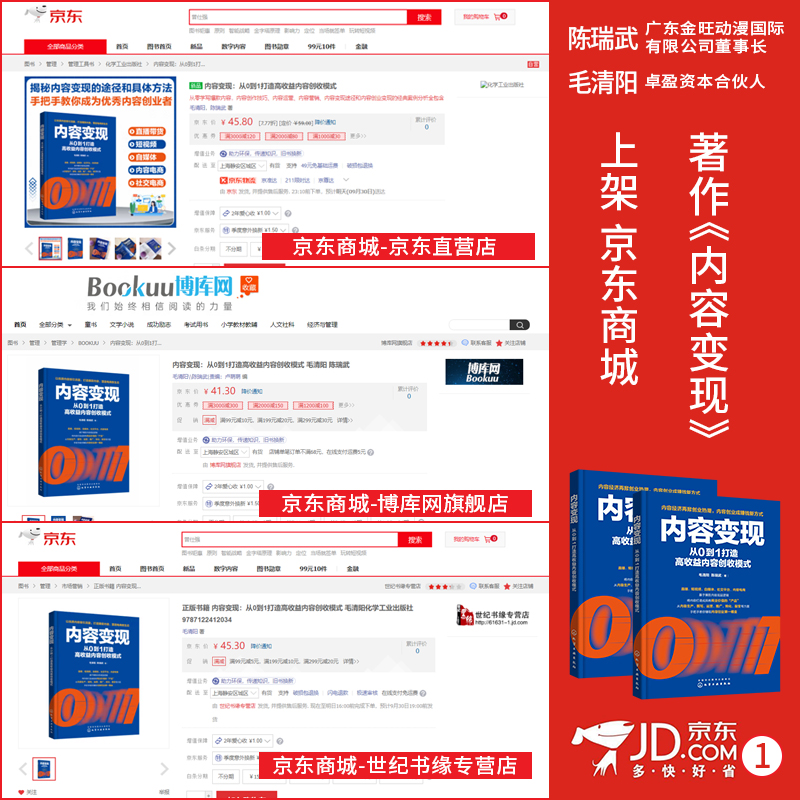 金旺动漫国际董事长,陈瑞武老师著作——《内容变现》上架知名购书渠道平台,京东图书商城,各大图书店铺上线,进行火爆热销,体现书籍的被认可程度以及知名度。