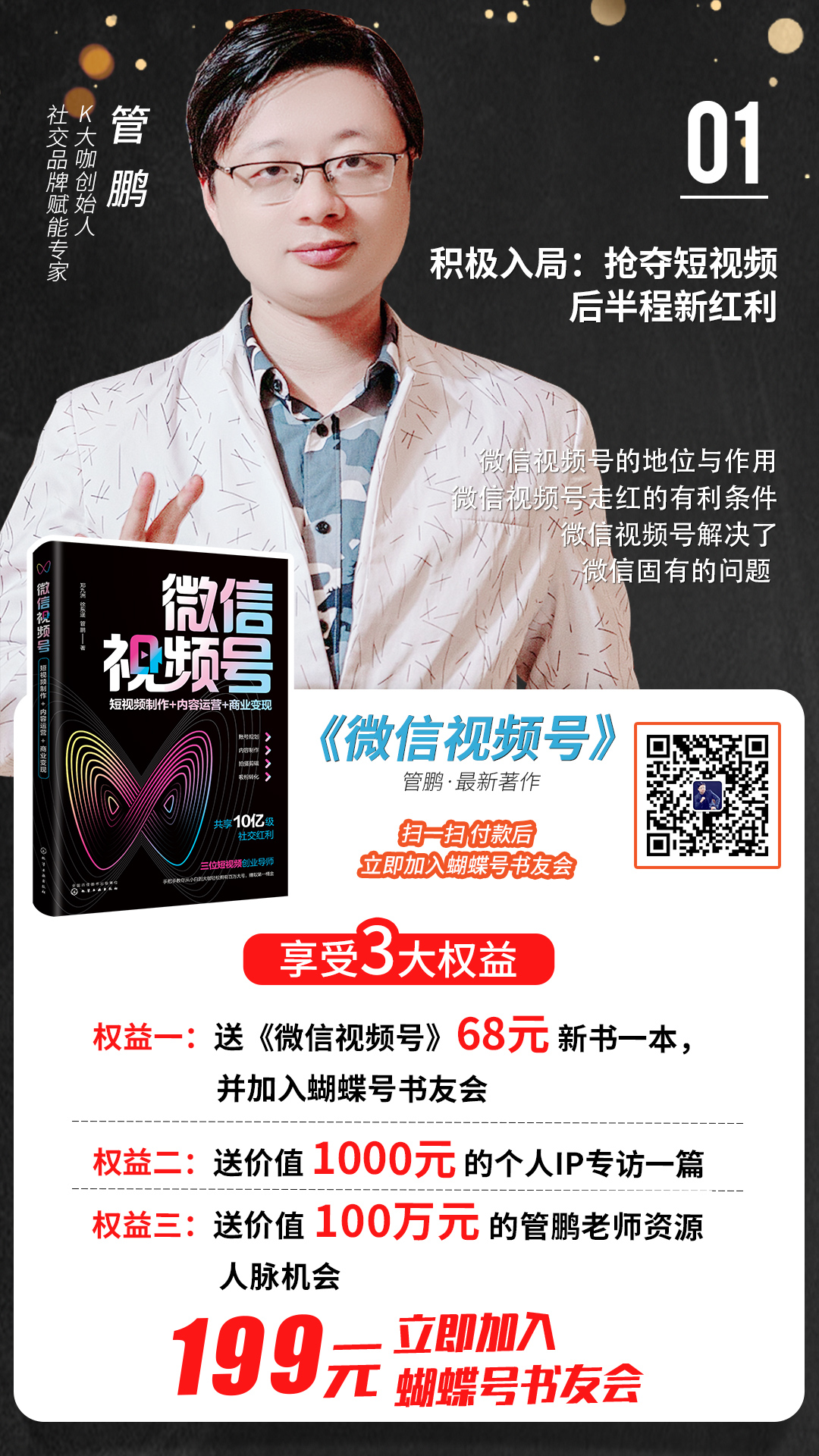 K大咖创始人管鹏老师著作《微信视频号》——199元立即加入蝴蝶号书友会,积极入局,抢夺短视频后半程新红利,加入蝴蝶号书友会,即可获得价值1100万管鹏老师资源人脉机会。