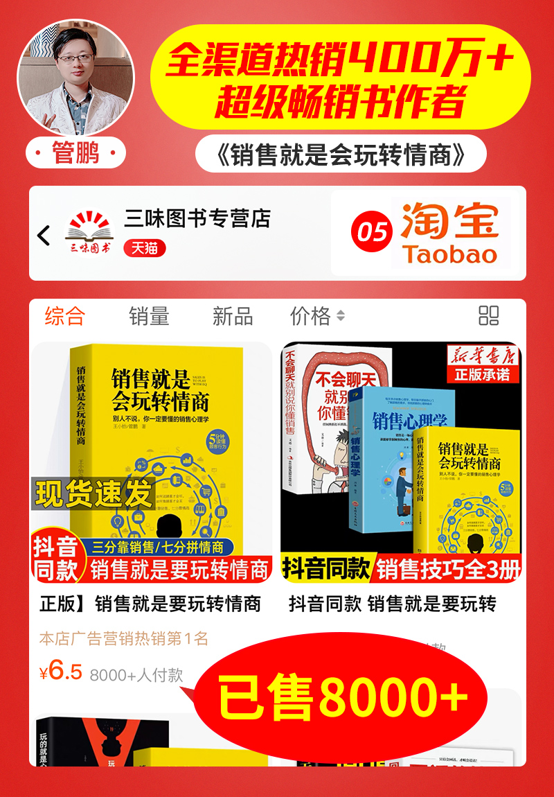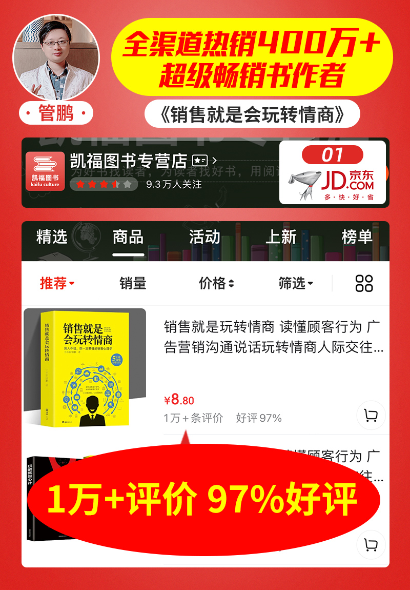K大咖创始人管鹏,百万畅销著作《销售就是会玩转情商》——淘宝平台书籍销量统计合集,全网爆火热销超400万册的销售人员必须看的一本书,掌握顾客心理,才能实现成交。