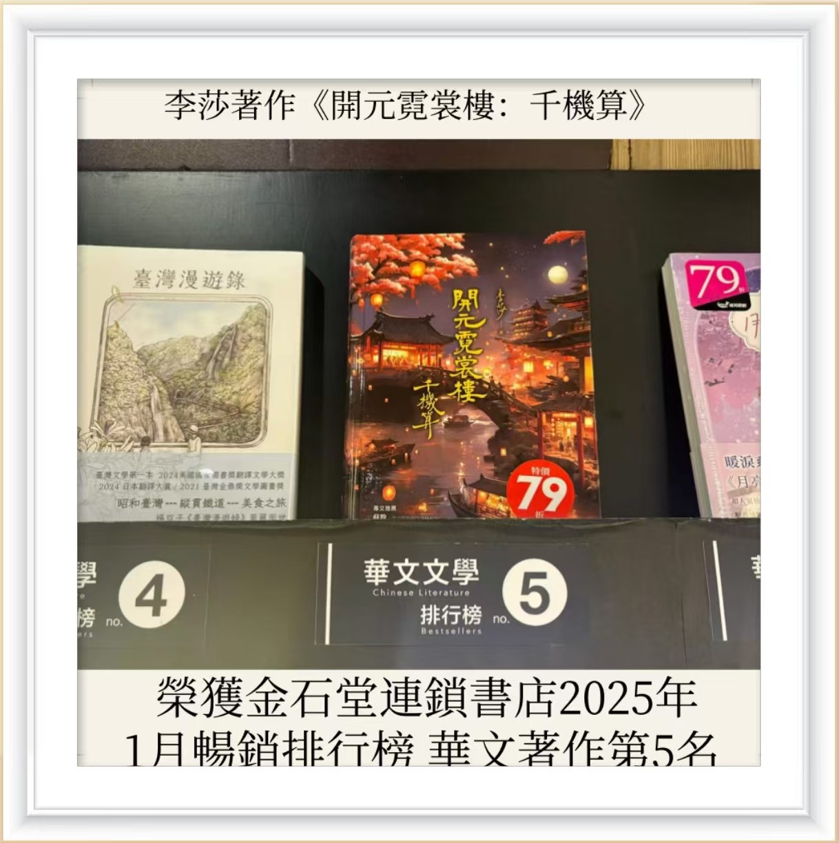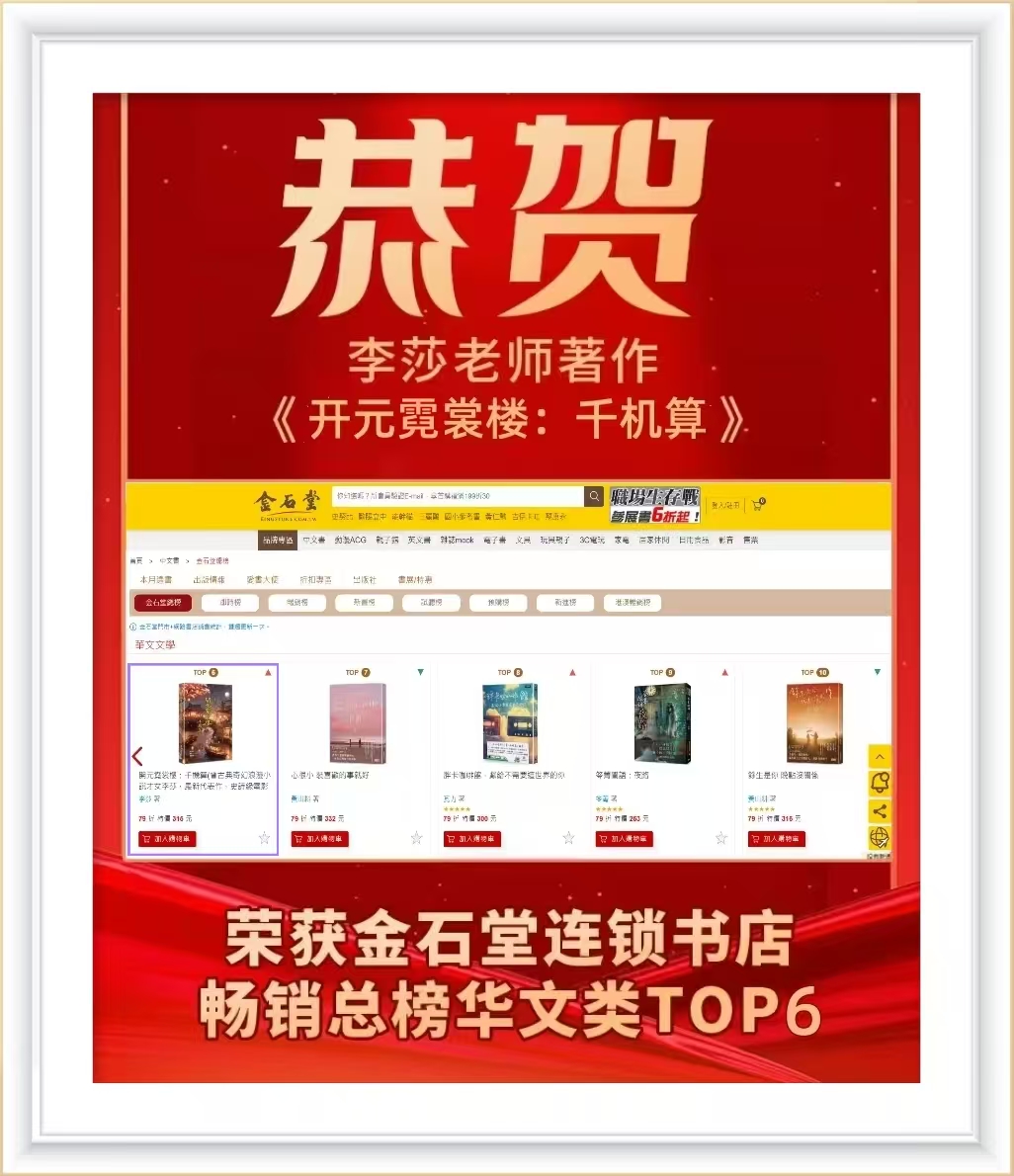 恭贺畅销书作者,李莎老师的著作《开元霓裳楼:千机算》在金石堂连锁书店的畅销总榜华文类评选中,成功斩获TOP6的佳绩!这不仅是对李莎老师创作才华的高度认可,更是作品自身魅力的有力见证。