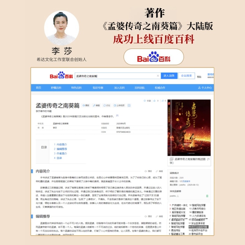 畅销书作家、希达文化创始人李莎女士通过经纪人吴艳与上海中青芳华文化旅游发展有限责任公司董事长解是非正式签署合作协议,捐赠其出版的系列小说书籍,展开全面合作。