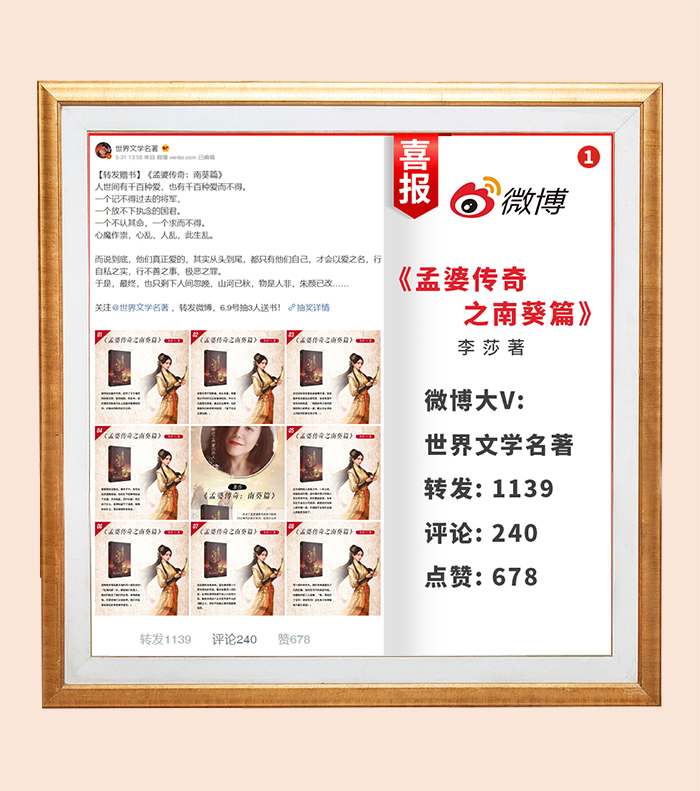 希达文化创始人李莎老师的著作:《孟婆传奇之桑黛篇》——微博大V转发数据海报图展示,由数名微博大V转发,深受广大网友喜爱,微博浏览量可观,转发及评论呼声很高。