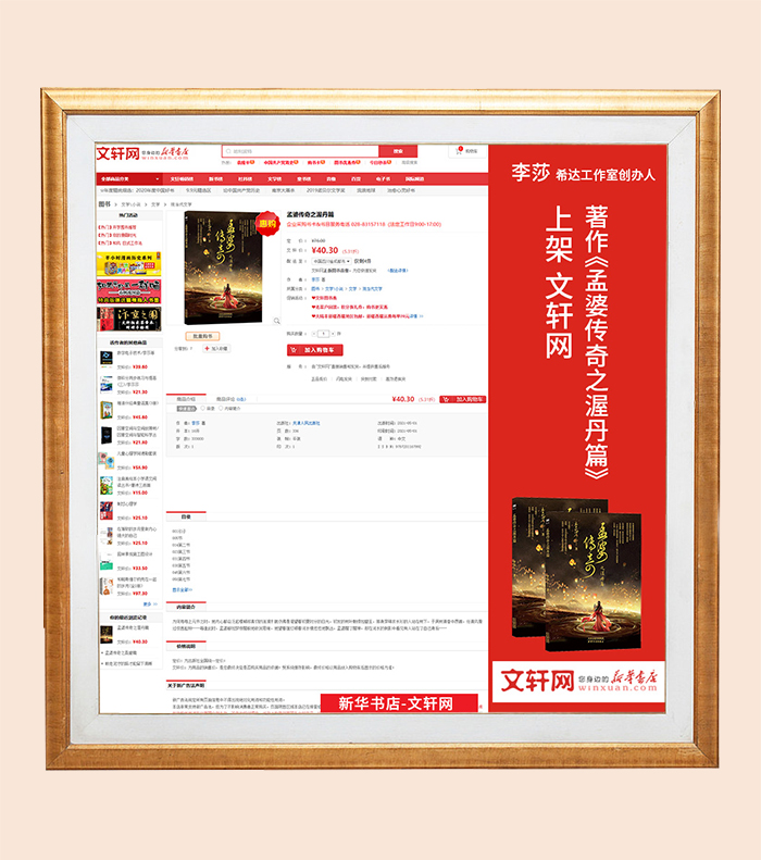 希达文化创始人李莎老师著作——《孟婆传奇之桑黛篇》上架知名购书渠道平台,新华书店-文轩网,进行火爆热销,体现书籍的被认可程度以及书作者较高的个人知名度。