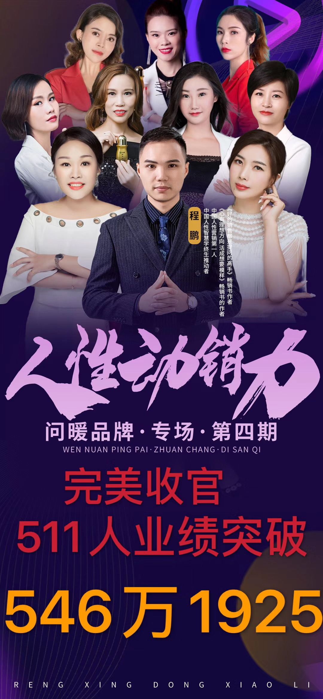 中国人性营销第一人:程鹏,问暖品牌的优秀团队积极培训,认真学习,刻苦钻研,品牌专场总业绩达到5461925元,与问暖品牌团队携手共进,相互赋能,深度合作,再创辉煌。