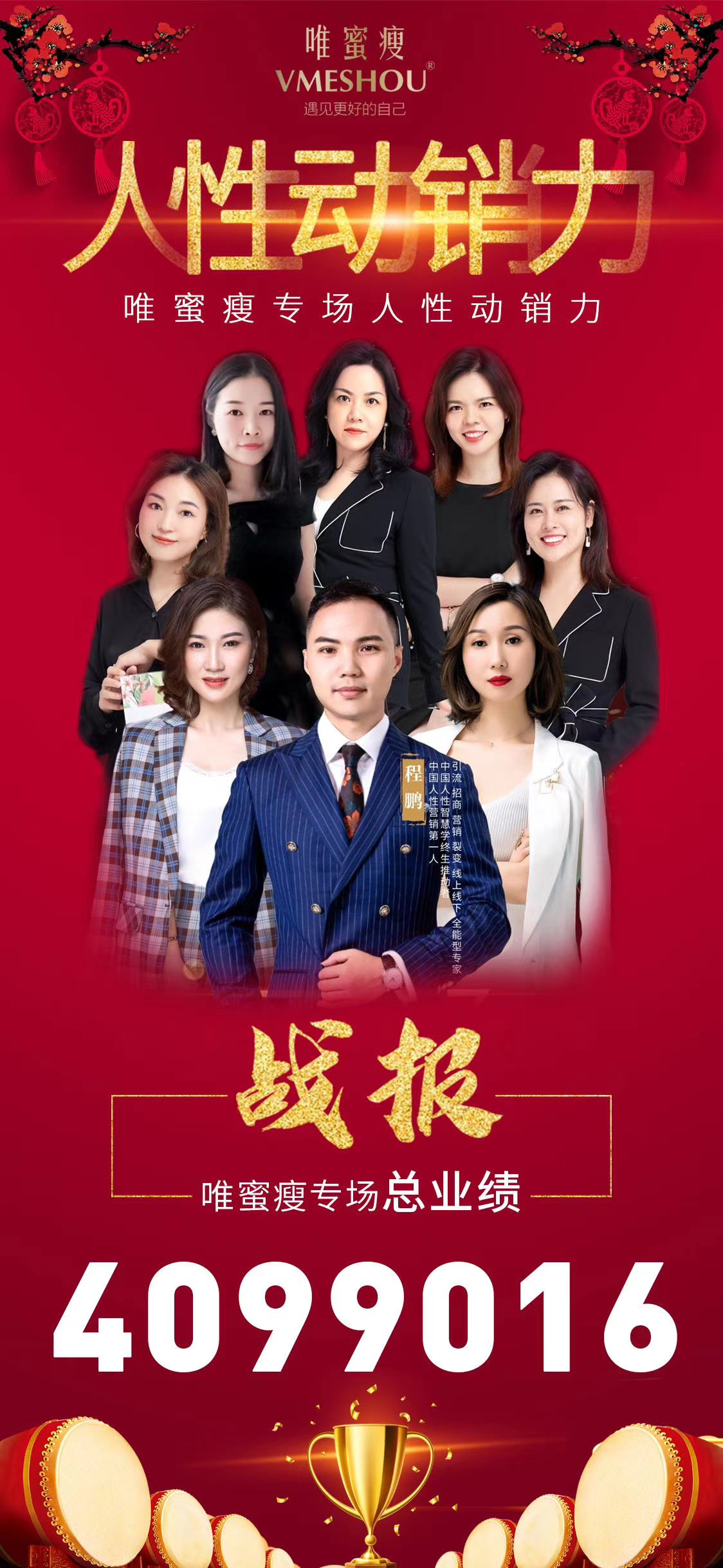 中国人性营销第一人:程鹏,唯蜜瘦品牌的优秀团队积极培训,认真学习,刻苦钻研,品牌专场总业绩达到4099016元,与唯蜜瘦品牌团队携手共进,相互赋能,深度合作,再创辉煌。