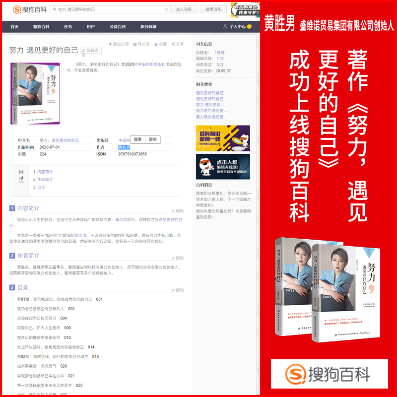 畅销书作者黄胜男老师的出版作品《努力,遇见更好的自己》——成功上线搜狗百科,搜狗百科是一部自由、开放、共享的百科全书,作为百科权威平台之一,为作品的可信度提供了有力凭证。
