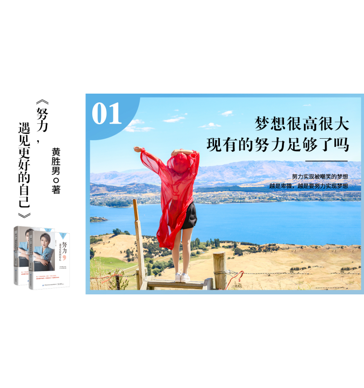畅销书作者黄胜男老师出版作品《努力,遇见更好的自己》书籍励志海报,努力实现被嘲笑的梦想,越是卑微,越是要努力实现梦想,真正的聪明人都在下笨功夫,态度决定人生的高度。