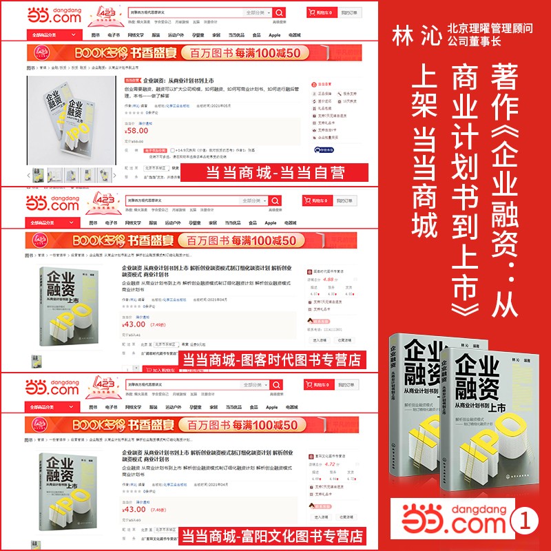 畅销书作者林沁老师出版作品:《企业融资:从商业计划书到上市》一一上架当当平台各大专营店销售,当当作为国内最权威的一家书籍销售平台,给作者提供了良好的销售条件。