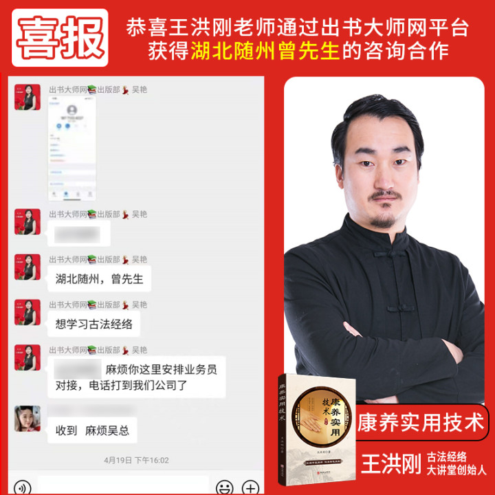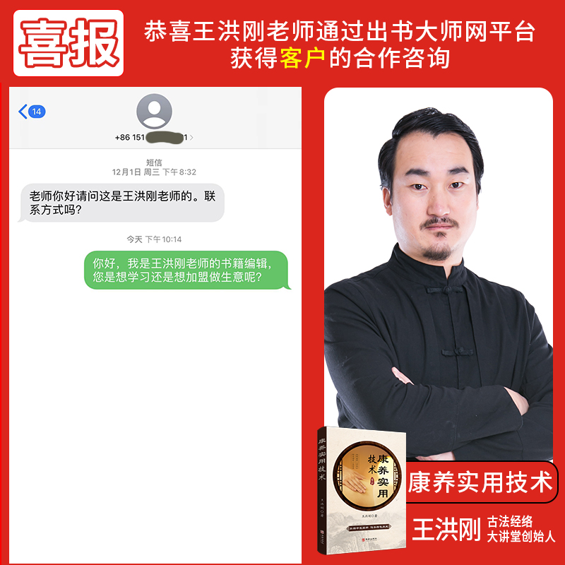 畅销书作者王洪刚老师,通过作者邦网站,获得景德镇徐先生咨询治疗的信息,体现出王洪刚老师个人以及品牌产品的民众信赖度,同时也展现了作者邦网站对书作者用心到位的营销推广。