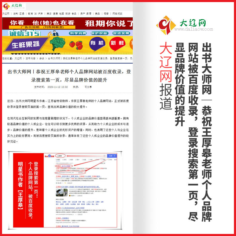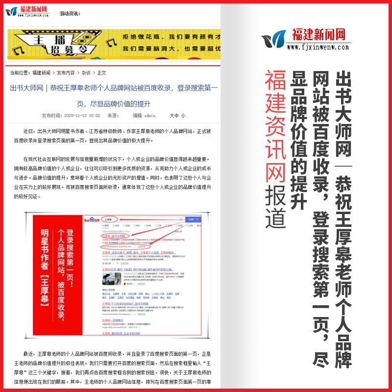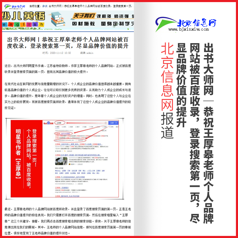 恭喜作者邦网明星书作者,江苏省特级教师、作家王厚皋老师的个人品牌网站,正式被百度收录并登录搜索页面的第一页,显现出其品牌价值的极大提升。被百度搜索页所收录!