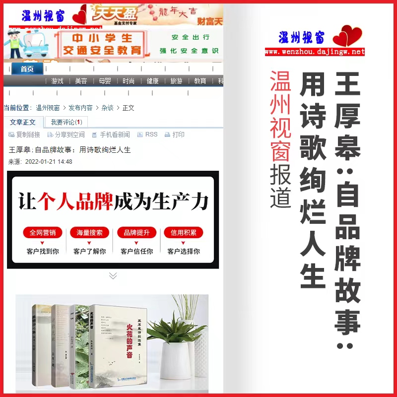 温州视窗报道:江苏省特级教师【王厚皋】先生——自品牌故事:用诗歌绚烂人生!自品牌故事让个人品牌成为生产力,全网营销个人信息、海量搜索个人信息、个人品牌提升、个人信用积累。