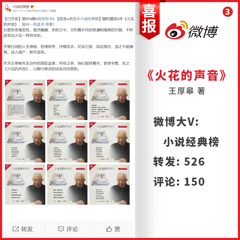 微博大V发文向大众推荐王厚皋先生诗作《火花的声音》浏览量,转发量,评论量都达到了不错的热度!作为王厚皋先生诗作的首轮读者,吟叹之余,撷其菁华,我们荟萃专集,名之《火花的声音》。