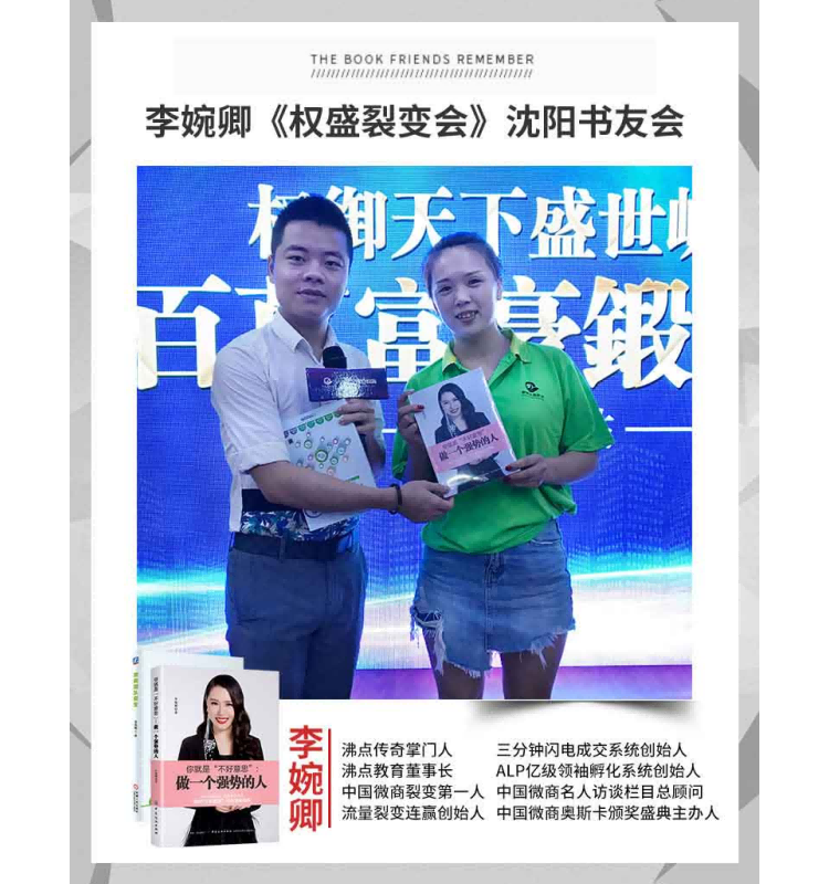 李婉卿老师在与权盛集团合作的裂变会活动中,举行著作《你就是“不好意思”:做一个强势的人》沈阳书友会,为在场书友与嘉宾带来不小的惊喜,现场赠书以及书友合影。