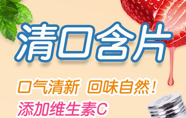 清口含片,口气清醒,回味自然,添加维生素C,多种口味,选择不再难,经典提神薄荷味,甘甜爽口山楂味,怡人沁香草莓味,酸甜可口正梅味,小瓶更方便,更便捷,小巧易携带。