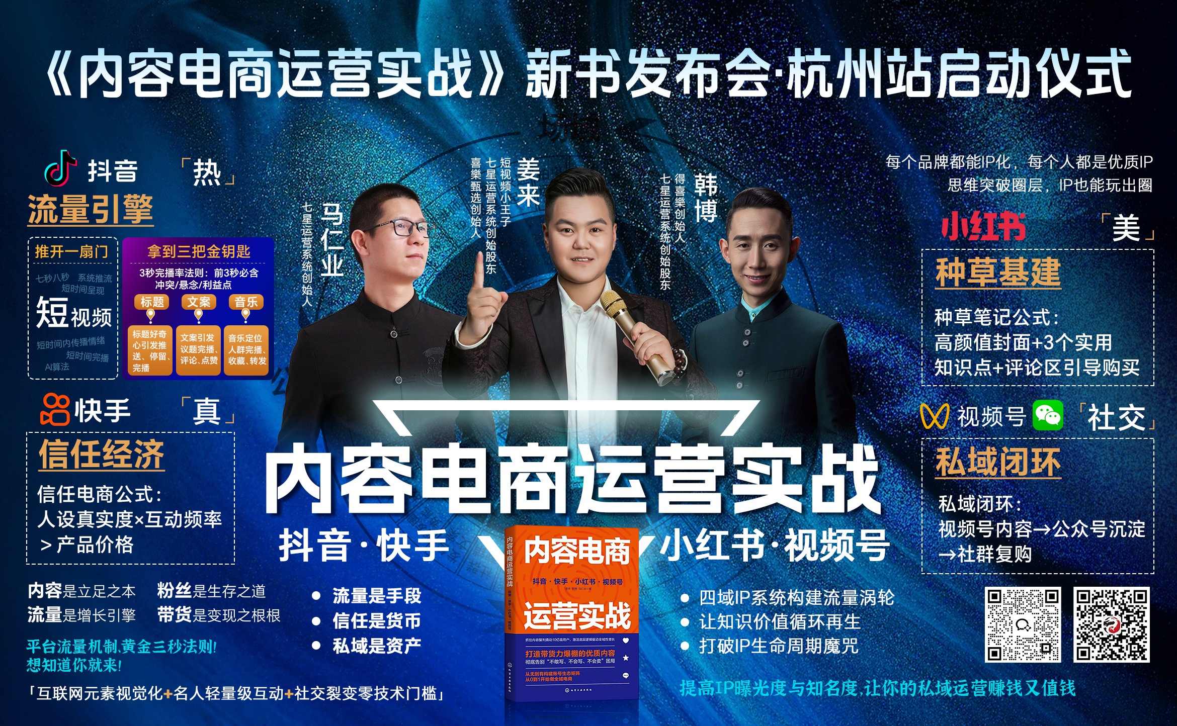 《内容电商实战运营》7月22日在杭州盛大首发!姜来、韩博、马仁业三位大咖联袂打造,深度解析流量获取、信任经济、私域闭环等核心策略,助力创业者、商家和品牌突破增长瓶颈!
