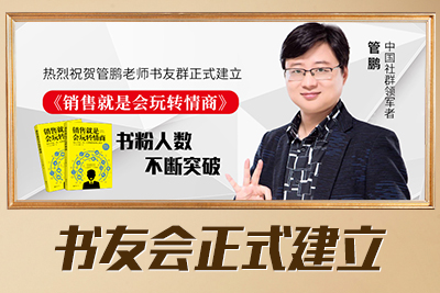 管鹏老师的新书《销售就是会玩转情商》刚一面世,市场反响热烈,好评如潮,业界大咖纷纷表达对此书的极致热爱与大力支持,书友群在广大书友的响应下正式建立,粉丝们可以畅聊此书。