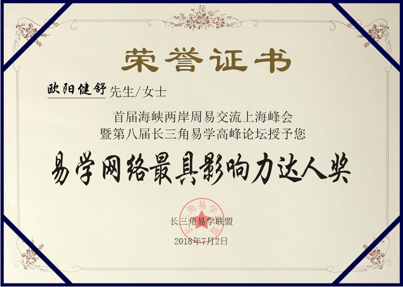 贺希达工作室李莎老师、欧阳健舒老师——荣获“易学网络最具影响力达人奖”,在这条文化传播的道路上,继续大力倡导、弘扬国学,欧阳老师正阔步向前,成为先驱者。