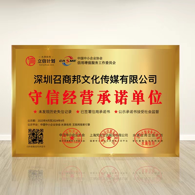 恭喜姜立鹏老师深圳召商邦文化传媒有限公司,荣获由中国中小企业协会、信用增值服务工作委员会认证颁发的—“守信经验承诺单位”荣誉证书,大大增加了深圳召商邦文化传媒有限公司实力及影响力。