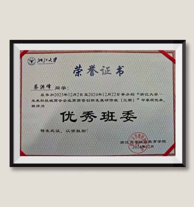 蔡洪峰老师:在参加2023年12月2日至2024年12月22日举办的“浙江大学——未来科技城商会高质量创新发展研修班(三期)”中表现优异,被评为“优秀班委”。