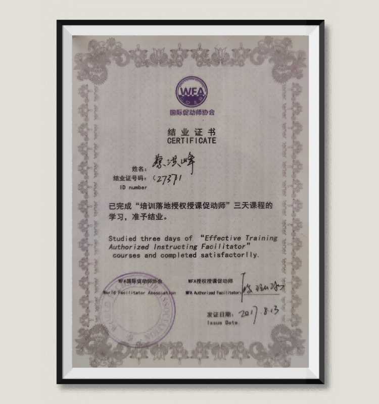 蔡洪峰老师参加由国际促动师协会举办为期三天的“培训落地授权授课促动师”课程学习,并且考核成绩优异,荣获“培训落地授权授课促动师”课程结业证书。