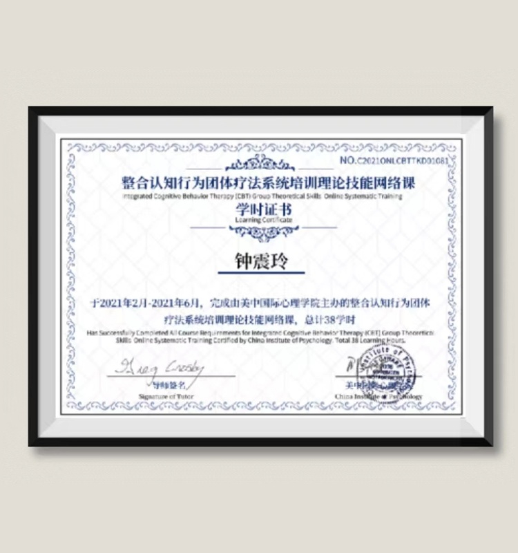 钟震玲老师荣获整合认知行为团体疗法课程认证,这奠定了钟老师在行业中的影响力,作为心理咨询资深导师能够在别人的心里成长的道路上给予一定的启示和帮助。