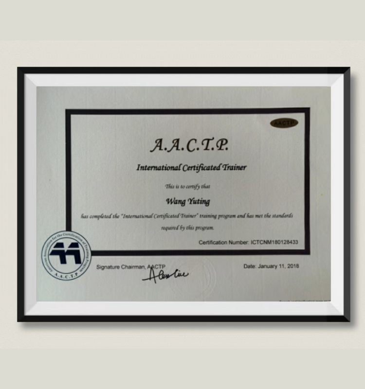 玉见优势创始人王玉婷老师拥有10年以上专业培训经历,从事一对一教练超过1000小时,累计培训和咨询2万+人,可提供中英文双语培训,经过考核,荣获“AACTP国际注册培训师资格证”。