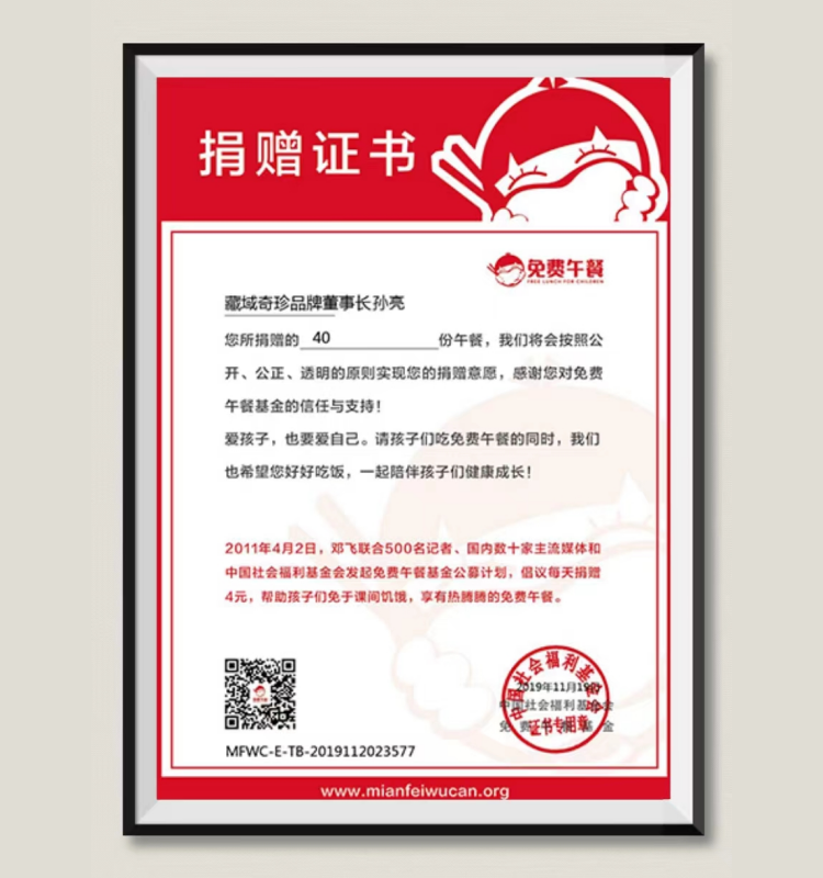 孙亮先生再度扛起社会公益的大旗,延续中国优良传统,捐赠出一份份温暖的爱心午餐,助力贫困儿童免于饥饿,健康成长。获得由中国社会福利基金会颁发的捐赠证书。