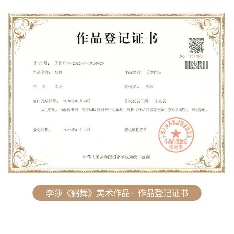畅销书作家李莎老师美术作品——《鹤舞》由李莎老师申请,经中国版权保护中心审核,根据《作者自愿登记试行办法》规定,予以登记,发表出品。