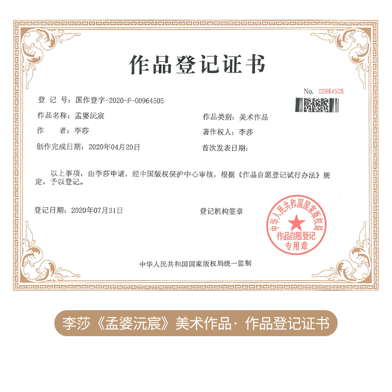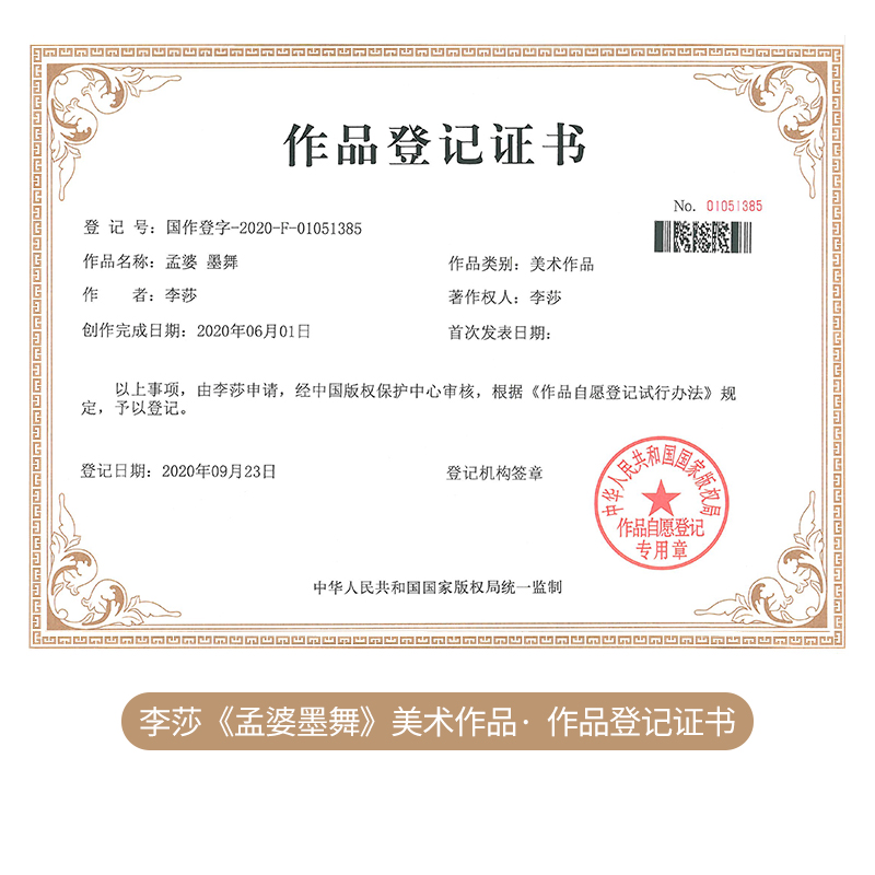 畅销书作家李莎老师美术作品——《孟婆墨舞》由李莎老师申请,经中国版权保护中心审核,根据《作者自愿登记试行办法》规定,予以登记,发表出品。