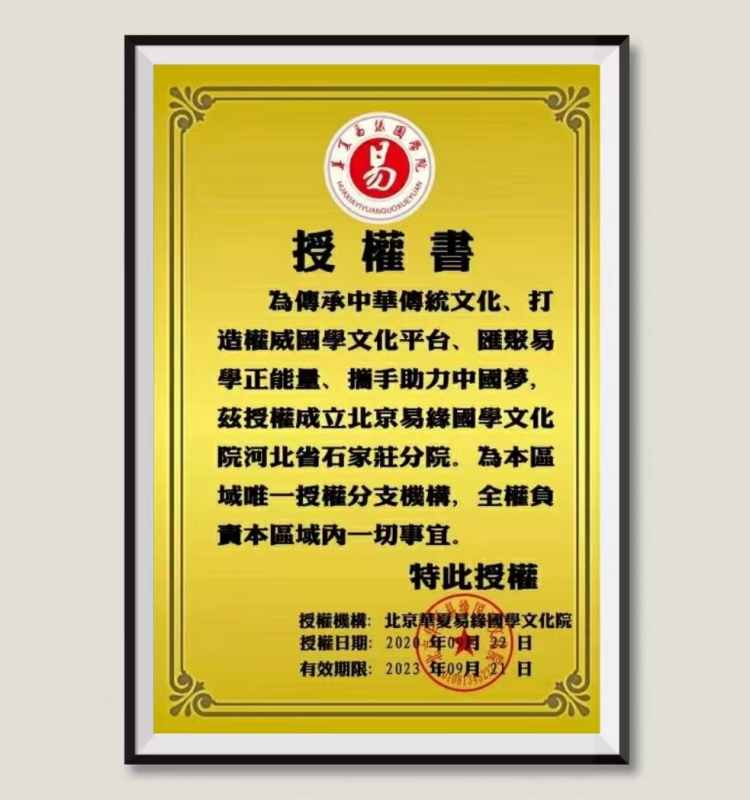 为传承中华传统文化、打造权威国学文化平台、汇聚易学正能量、携手助力中国梦,兹授权成立北京易缘国学文化院河北省石家庄分院。为本区域唯一授权分支机构,全权负责本区域内一切事宜。