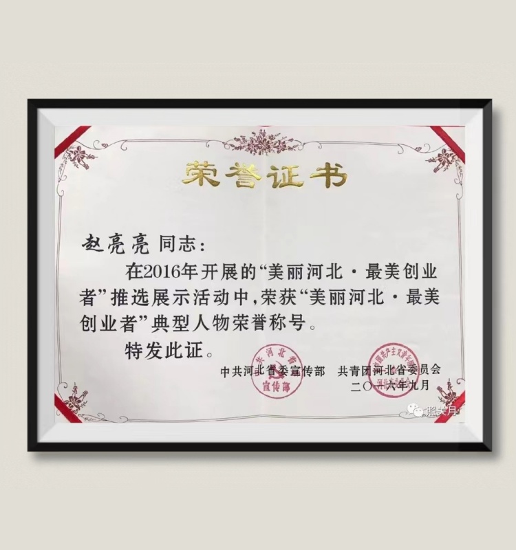 赵亮亮老师在2016年开展的“美丽河北·最美创业者”推选展示活动中,荣获“美丽河北·最美创业者”典型人物称号,该证书是由中共河北省委宣传部与共青团河北省委员会联合颁发。