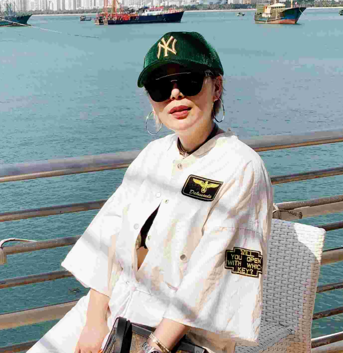 黄胜男老师戴着一副时尚的墨镜,站在蔚蓝的海边,阳光下镜片闪烁着神秘而迷人的光泽,她身穿轻盈的衣物,随风摇曳,与海浪的节奏相呼应,展现出一种悠然自得、不受拘束的海边度假风情。