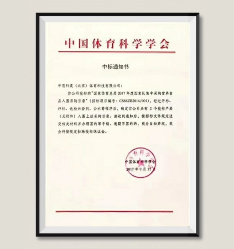智燃智简·运动营养食品产品——入围“国家体育总局2017年度国家队集中采购营养食品采购目录”,获得有中国体育科学学会下发的中标通知书,正式了智燃智简产品的实力与安全。