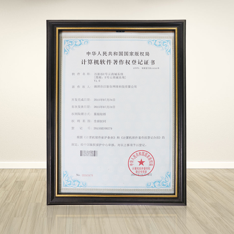 深圳市百新谷网络科技有限公司,百新谷E号云商城系统V1.0软件通过审核,获得中华人民共和国国家版权局下发的——《计算机软件著作权登记证书》。