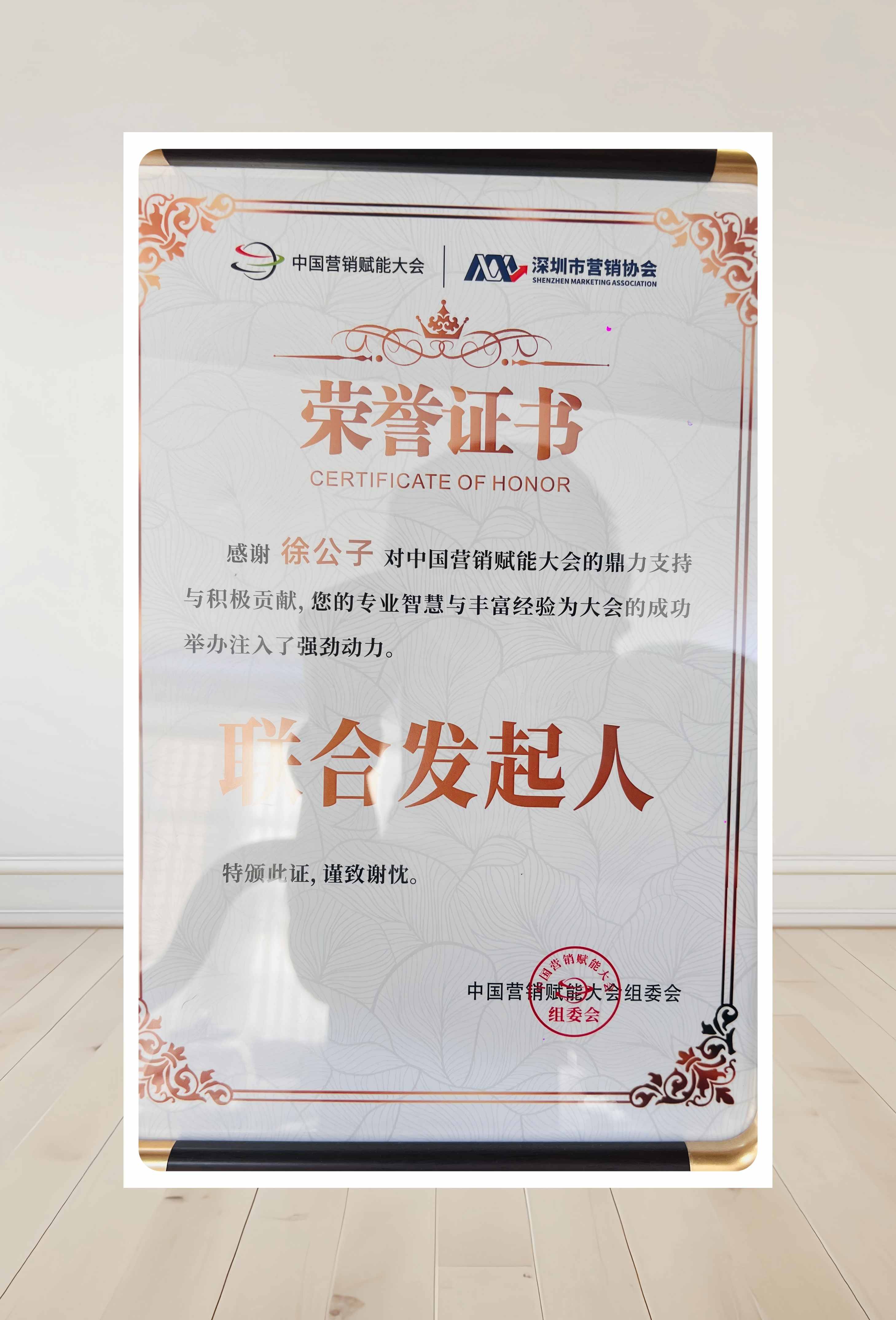 徐公子鼎力支持中国营销赋能大会,深度参与筹备策划,整合产业资源、助力嘉宾邀约与生态共建,以实际行动赋能大会高质量举办,获授联合发起人称号,彰显行业担当。