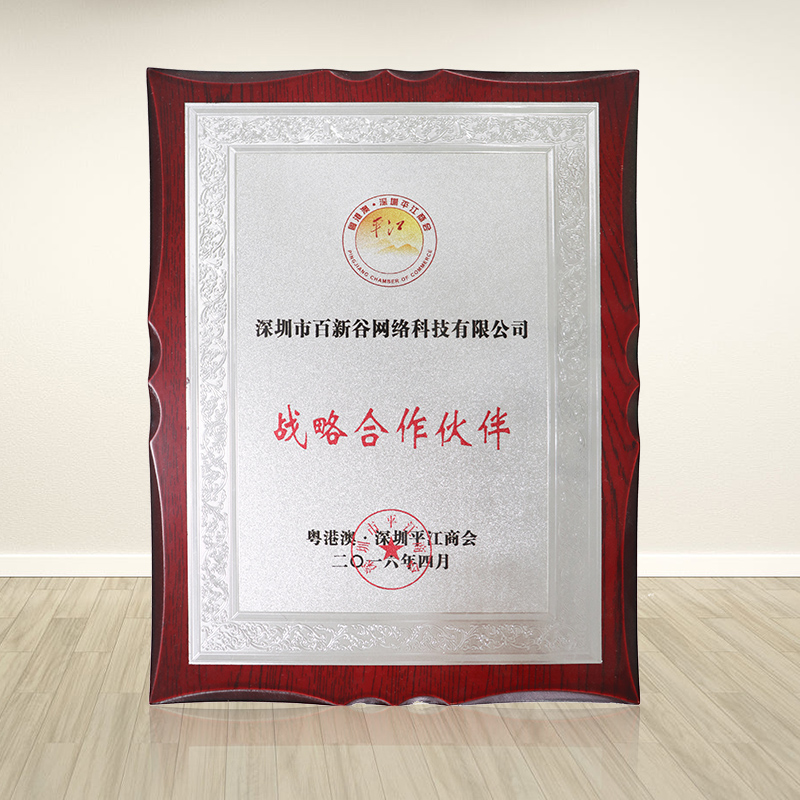祝贺深圳市百新谷网络科技有限公司与粤港澳·深圳平江商会达成战略合作,强强联手,并颁发了由粤港澳·深圳平江商会认证的,深圳市百新谷网络科技有限公司战略合作伙伴证书。