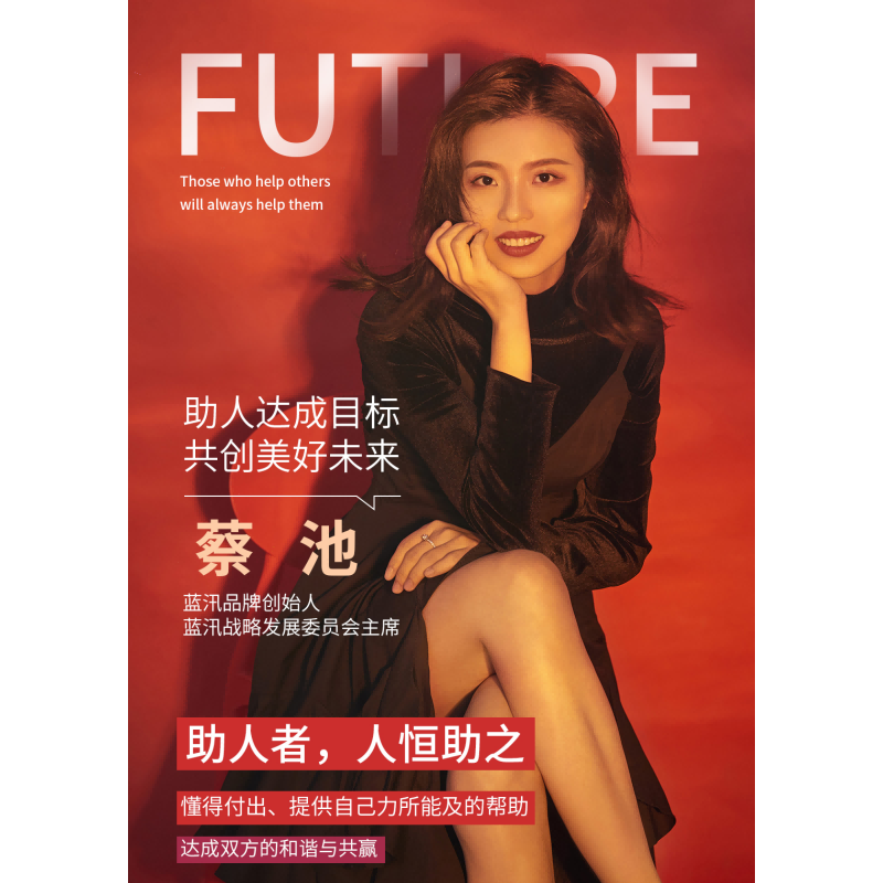 蓝汛品牌创始人蔡池,书作者人物封面设计,她持续创造社交新零售的传奇,她为蓝汛品牌定的slogan是:一辈子卖好一贴膏药!以初心筑梦,致蓝图。她是长期主义者,她更是持续连赢的创业导师。