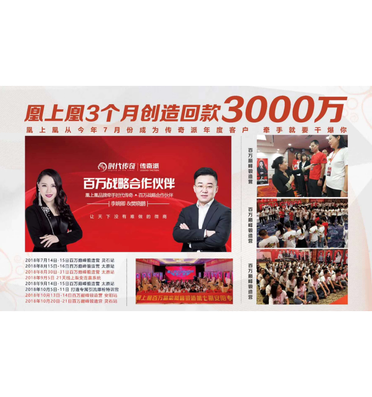 李婉卿老师百万战略合作伙伴——凰上凰3个月创造回款3000万,携手凰上凰创始人樊晓鹏一起,为团队举行数次百万巅峰锻造营,让凰上凰团队的运营、成交等模式焕然一新,创造傲人成绩。