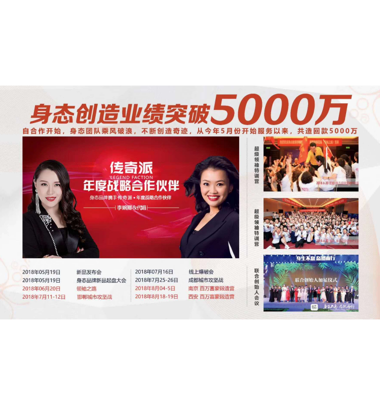 李婉卿老师年度战略合作伙伴——身态品牌创造业绩突破5000万,自从合作开始帮助身态品牌团队乘风破浪,不断创造奇迹,合作开展新品发布、新品起盘、百万富豪锻造营等会议,效果极佳。