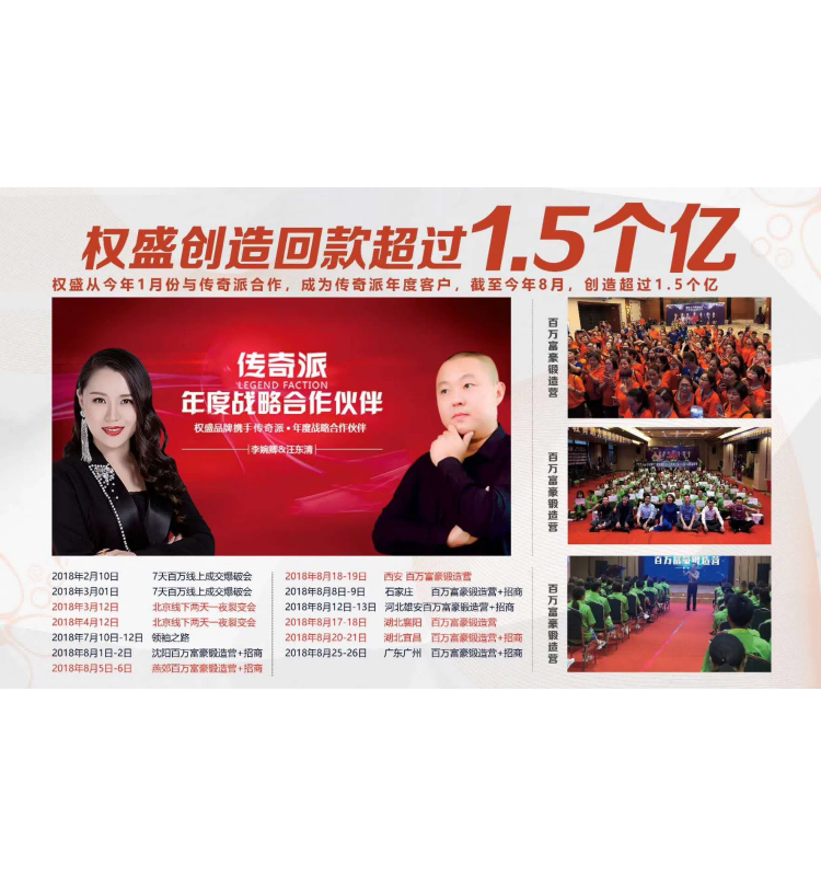 李婉卿老师年度战略合作伙伴权盛集团,作为传奇派年度客户,在全国各城市合作开展数十次裂变、爆破、百万富豪锻造营会议,累积帮助权盛集团招商创造回款超过1.5个亿。
