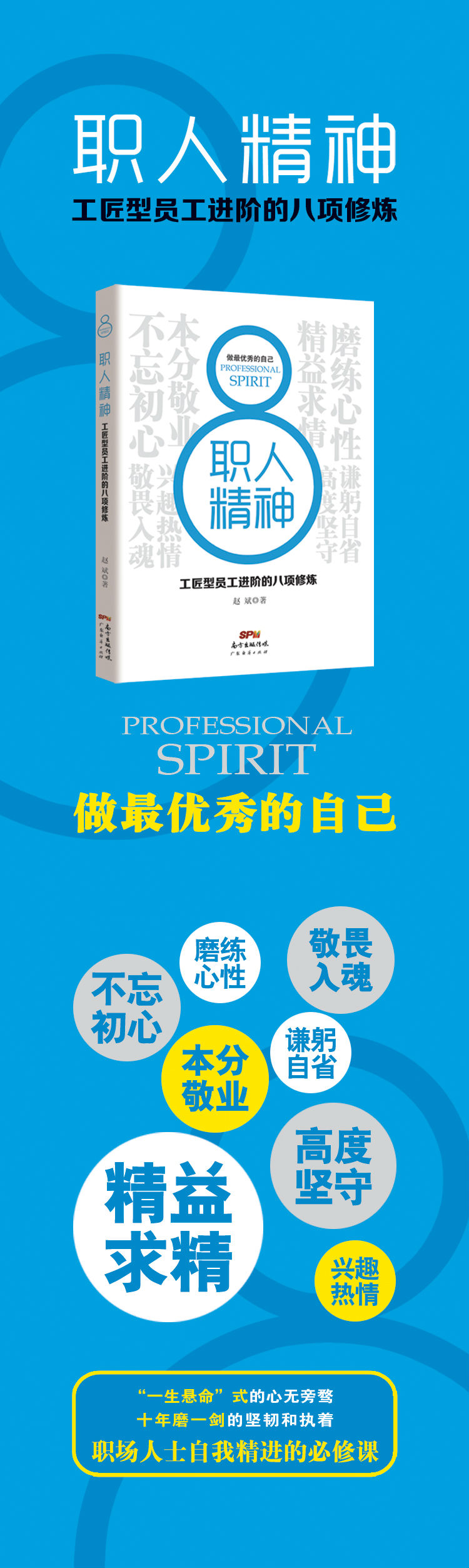 职人工匠精神,对于职业人士,意味着专业、敬业、踏实、耐心,褪去浮躁,沉下心来,本分做事,将本质工作精心打磨,实现由量变到质变的转化,打造个人品牌。