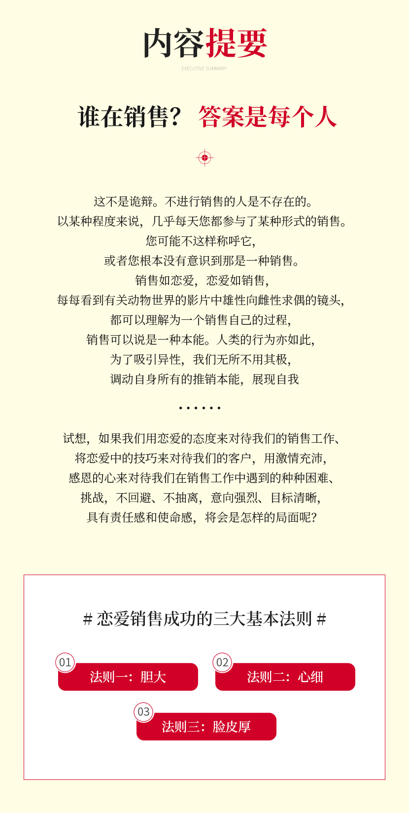 :《销售如恋爱》销售如恋爱,恋爱如销售,我们在销售工作中遇到的种种困难、挑战,不回避、不抽离,意向强烈、目标清晰,具有责任感和使命感。