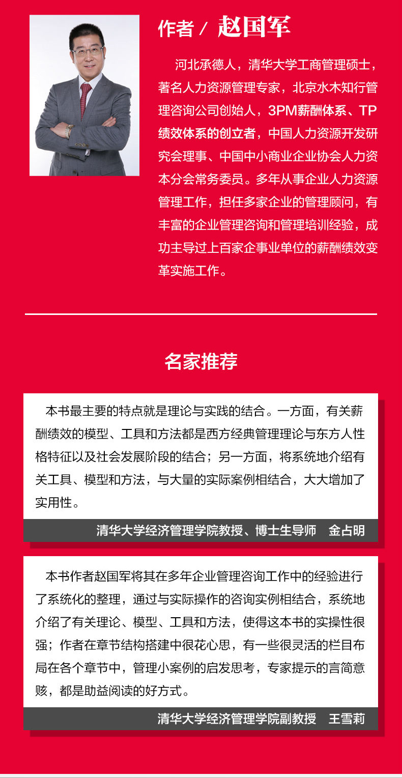 赵国军 河北承德人,清华大学工商管理硕士,著 名人力资源管理专家,北京水木知行管理咨询公司创始人,3PM薪酬体系、TP绩效体系的创立者,中国人力资源开发研究会理事、中国中小商业企业协会人力资本分会常务委员。多年从事企业人力资源管理工作,担任多家企业的管理顾问,有丰富的企业管理咨询和管理培训经验,成功 过上百家企 的薪酬绩效变革实施工作。