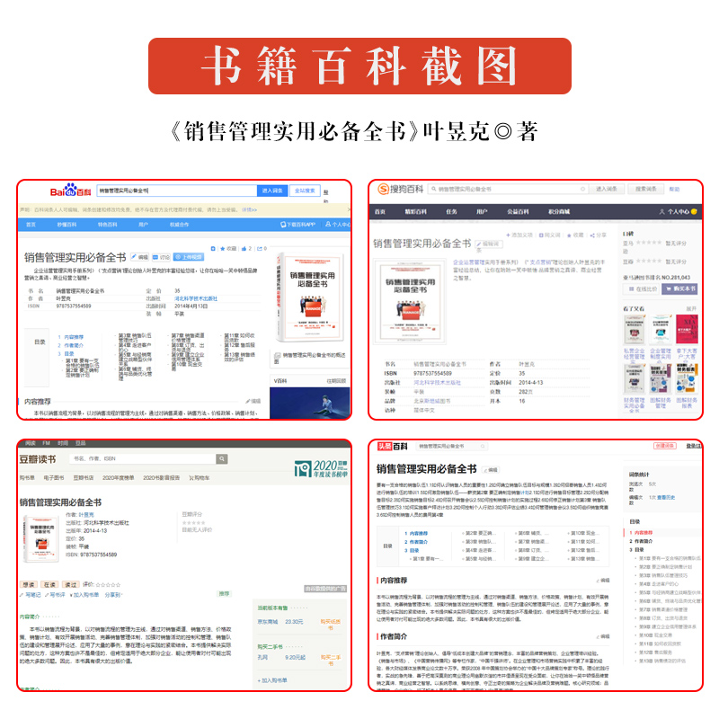 第三,突出实用性。《销售管理实用全书》作者叶昱克为“支点营销”理论创始人,在企业管理和市场营销实践中积累了丰富的经验,了解用人单位的需要,从销售技能入手,让本书更具实用性。
